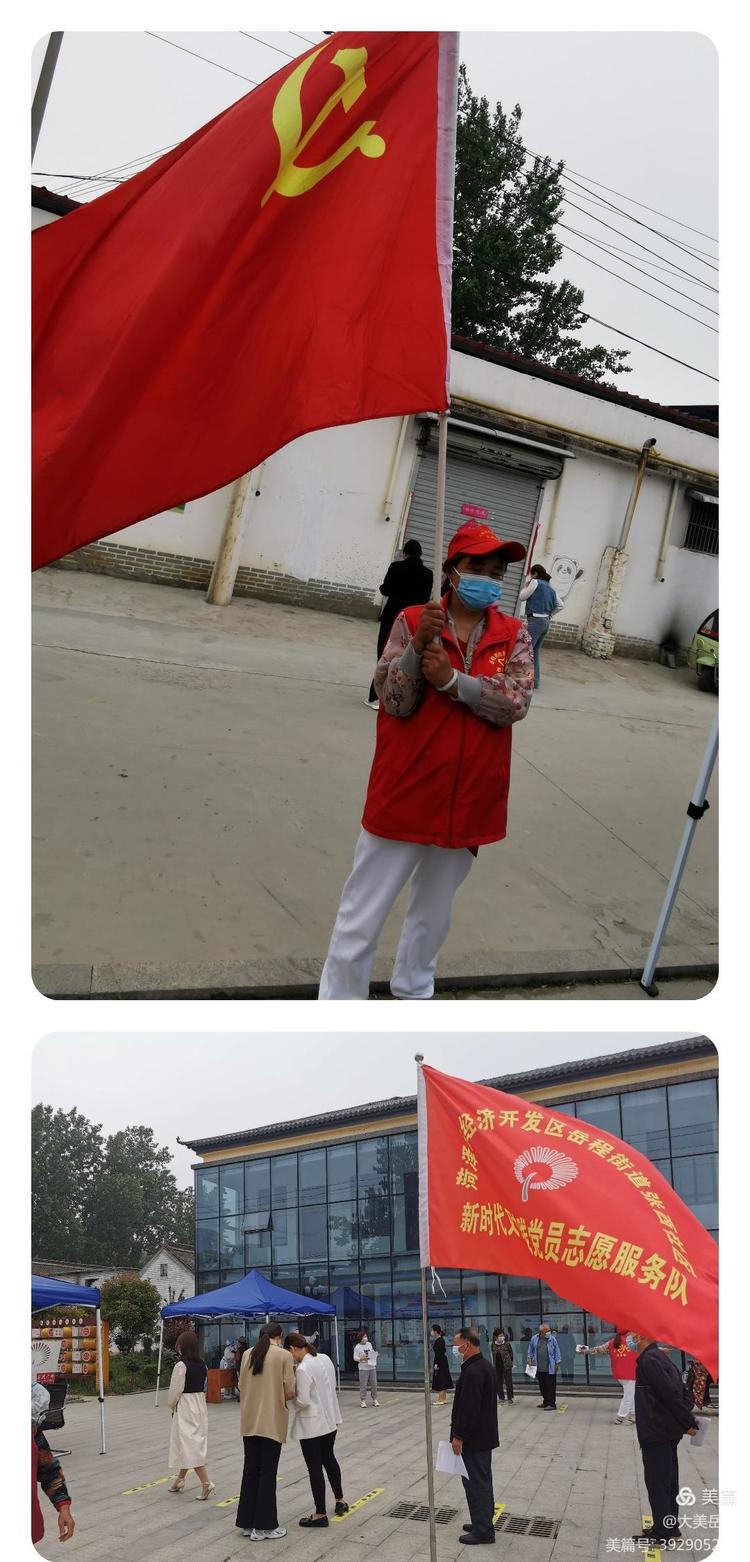 图为:党旗和党员志愿服务旗在核酸检测飘扬