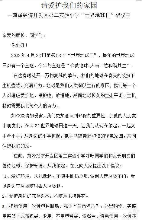 2022年4月22日是第53个“世界地球日”,我国今年的地球日主题为“珍爱地球 人与自然和谐共生”。菏泽经济开发区第二实验小学以此为教育契机,引导全体师生节约资源、珍爱环境的意识,举行“善待地球 爱护家园”主题教育活动。