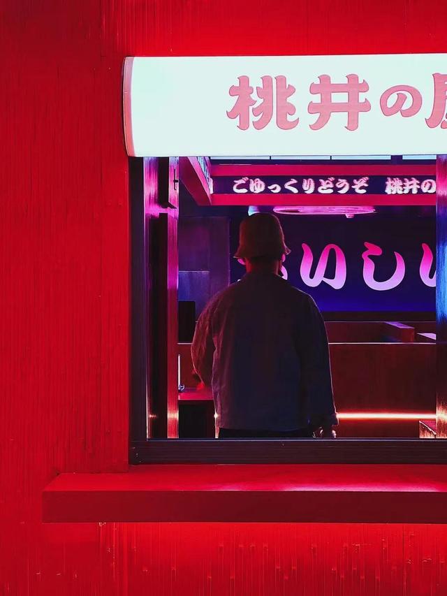 这家日料店叫桃井の屋。一入店铺就能看到裸眼3D大屏,大面积的红色和实木搭配,再加上霓虹灯、滚动的红色字幕,极具氛围感。