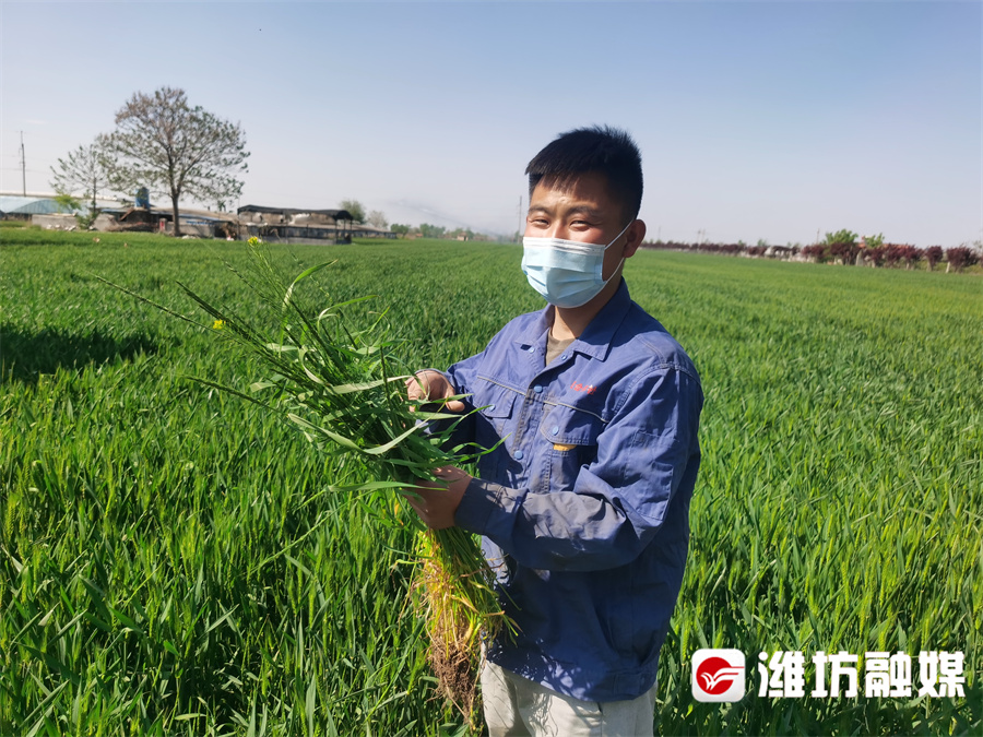 潍坊日报社潍坊融媒讯 5月4日,寒亭区高里街道一空桥惠民农作物种植专业合作社的麦田里,皮肤黝黑的孙化飞正在为麦田“听诊把脉”。