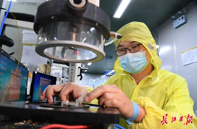 在园区标志性建筑“马蹄莲”办公的武汉锐奥特科技有限公司,研发部工程师马济亮(36岁)在洁净的研究室进行光模块的测试。他本科毕业于长江大学,负责该公司新品的研发和测试。