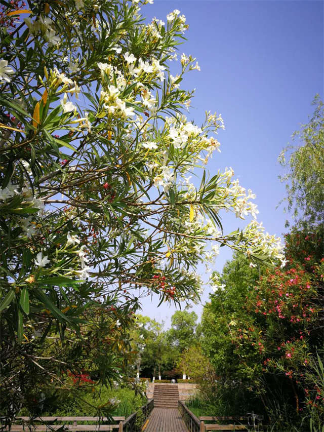 “叶如青竹花似桃,丹凤笑靥艳百娇”,描写的就是夹竹桃。夹竹桃又名柳叶桃、半年红,属常绿大灌木,高可达5米,花似桃,叶像竹,花大、艳丽、花期长,从春天一直可以花开花落到秋天,此起彼伏,有很强的观赏性,在我市各大公园及部分小区、马路边都能见到这种奇特的树木。