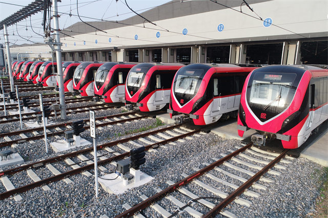 常州市地铁1号线的每一列列车在正式开通前都完成试运行。这是列车在百丈车辆段“集中亮相”时的情境。