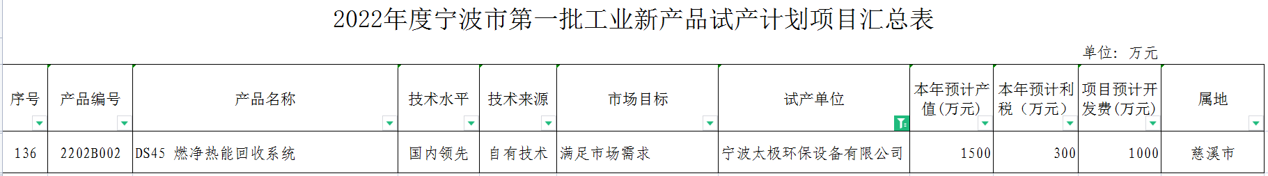 根据甬经信创〔2022〕57号文件《关于公布2022年度宁波市第一批工业新产品试产计划项目的通知》,经企业网上申报,各地经信主管部门审查,宁波市经信局组织审核评审,公示宁波涂协会员单位——宁波太极环保设备有限公司“DS45 燃净热能回收系统”入选该计划。