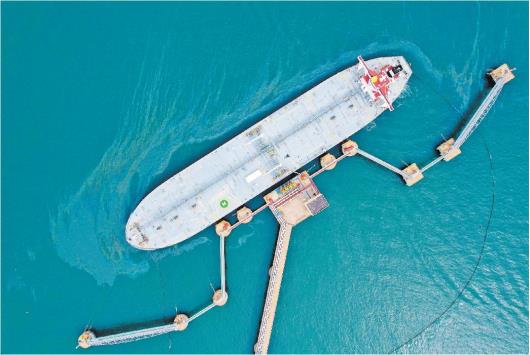 日前,巴哈马籍“丽塔”油轮在山东港口青岛港油港码头卸载进口原油。(□记者卢鹏通讯员吴绍洋报道)
