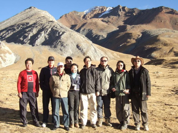 2009年,韦慧晓(右二)在孙晓明教授(右一)和时任西藏地勘局区域地质调查大队副队长易建洲(左三)的带领下,考察海拔5000余米的藏南造山型金矿。