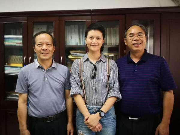 2018年6月29日,韦慧晓回母校,跟导师陈炳辉教授(左)和地球科学与工程学院院长王岳军教授(右)合影。