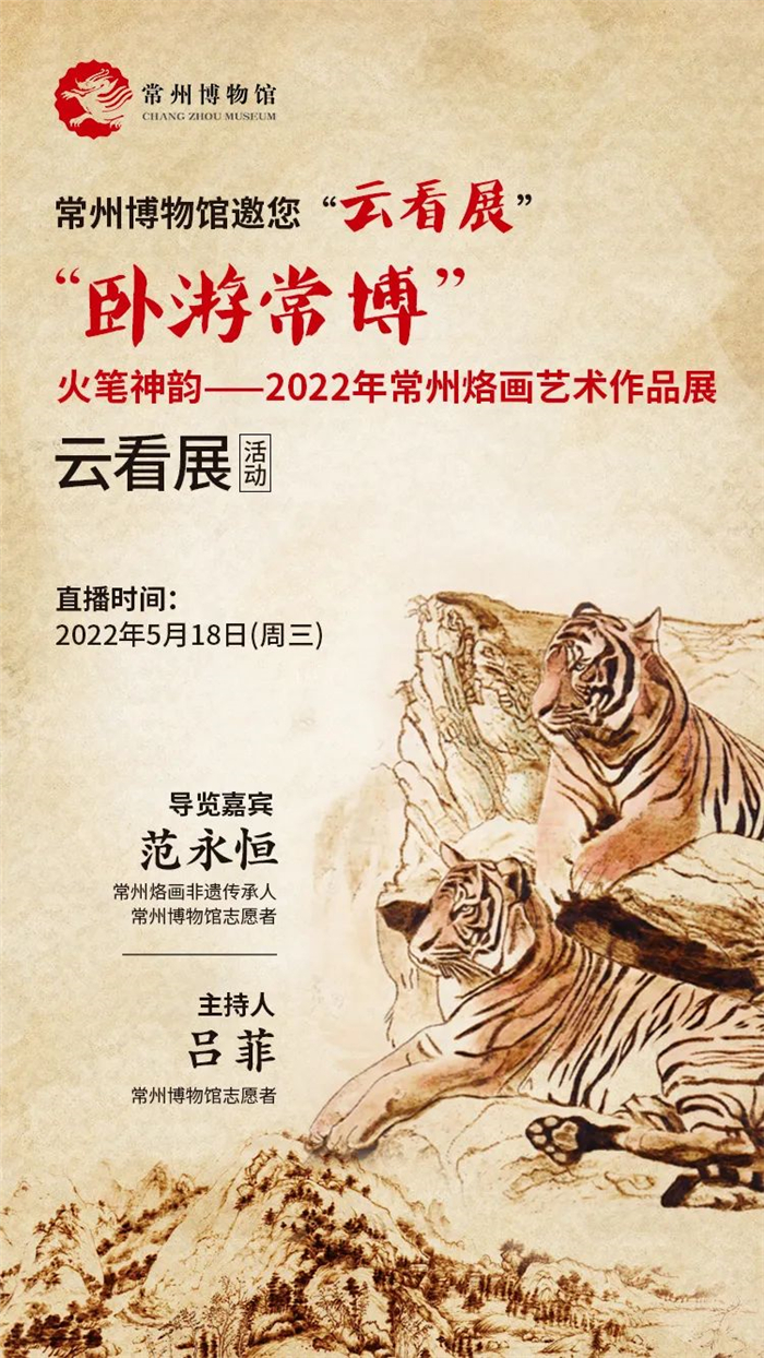 内容:烙画是以经过加热的金属在竹、木、纸张等媒材上以不同温度产生的焦痕作画的一种民间艺术。常州烙画历史悠久,具有独特的艺术风格和表现方法。自4月19日起,“火笔神韵——2022年常州烙画艺术作品展”在常州博物馆一楼特展厅展出,为了让公众足不出户观赏展览全貌,了解常州烙画这一小众艺术形式,常州博物馆将于“5·18国际博物馆日”当天推出“云看展”活动,由常州烙画非遗传承人、常州博物馆志愿者范永恒带您云端看展。