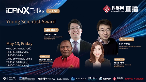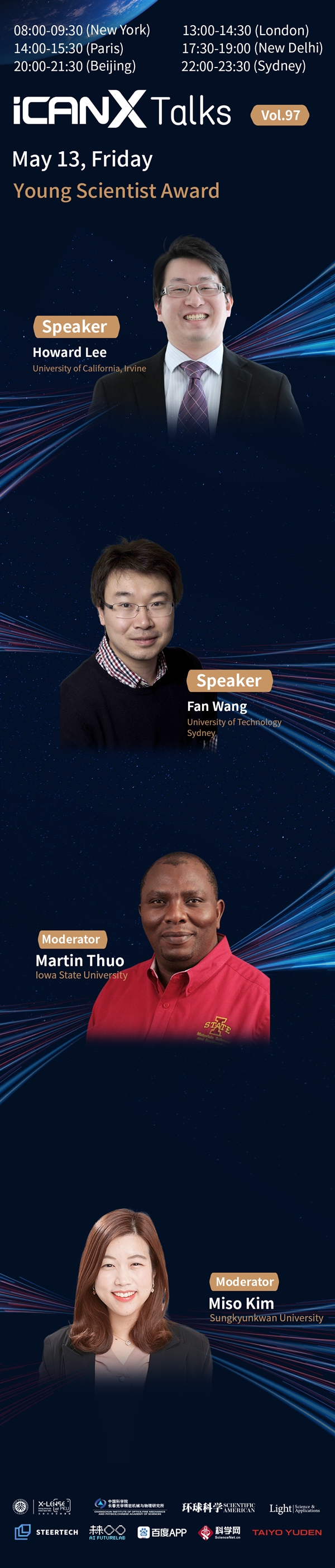 2022年5月13日晚 8:00(北京时间),大家期待已久的 iCANX Talks第97期即将重磅来袭,本期直播我们迎来iCANX青年科学家奖专题,邀请到加州大学的Howard (Ho Wai) Lee教授和来自悉尼科技大学的王帆教授来到iCANX Talks讲座系列,敬请期待!