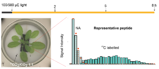 李磊教授研究团队创建了蛋白质周转率测定的蛋白质质谱分析平台,利用稳定同位素13CO2标记,发现了高强度光照可以激活包括D1在内的七十多种蛋白质周转率快速升高,多组学分析发现高光激活蛋白酶表达激活和蛋白质降解类氨基酸的快速富集,证实了高光引发广泛的蛋白质降解。研究发现,虽然蛋白质因为光损伤发生快速降解,多数蛋白质的编码基因被高光激活表达,蛋白质的丰度并未发生明显变化,而仅有少数蛋白质的编码基因未被激活,蛋白质水平呈现降低趋势,从而成为光损伤的蛋白质靶点。