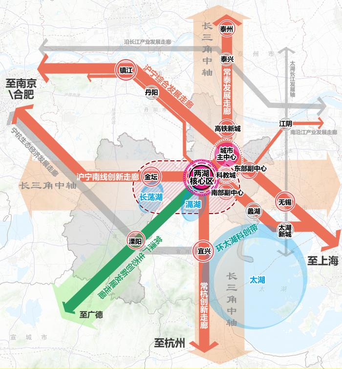 长期以来,常州的城镇空间发展重点偏向上海方向的市域东部。但从地图上看,“两湖”创新区在常州较偏向西南。