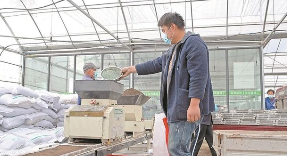 铲底土、递秧盘、加稻种、运秧盘……在育秧工厂的大棚里,七八名工人各司其职,围着正在运转的全自动水稻育秧播种流水线,有条不紊地忙碌着,现场一派热火朝天的景象。一张张空秧盘随着机器的运转,实现从铺土、播种、洒水、覆土全程自动化。做好的育秧盘接着就被小车运送至一侧有序摆放。