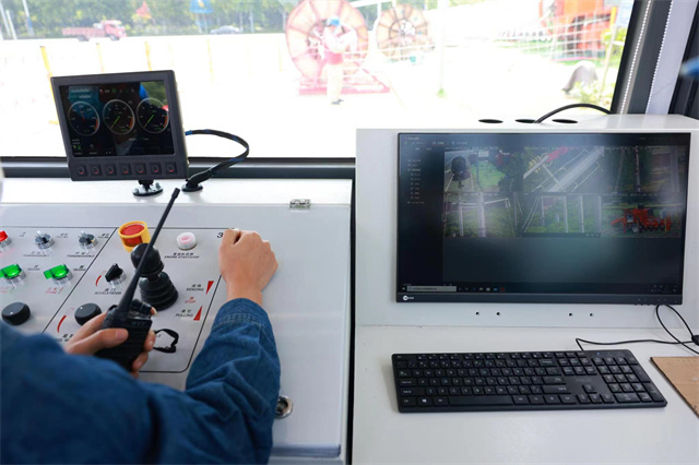 在现场集控室内的控制柜上,装有两面监控屏,并配有启动、刹车、油门等按钮,可以实时监控并控制现场的牵张设备,操作人员可以根据实时数据画面,按键操作。智能控制台还可以实时采集设备开启、停机、放线里程数等数据,使操作人员准确掌握设备的工作状态,并作事后评估改进。