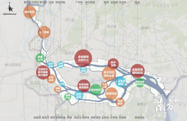根据最新公布的《广州市珠江沿岸高质量发展建设规划》(公示版),广州将培育复合多元、创新引领的现代服务业集群,构筑滨水创新策源地。在中心城区段产业功能结构规划图中洛浦街是其中一个重要区域,其中南浦岛产业定位为低碳产业,洛溪岛为文创休闲。