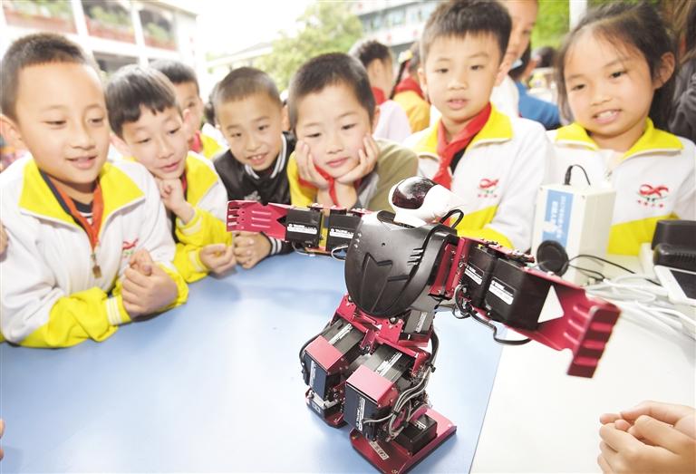 5月20日,贵阳市南明区甲秀小学开展“科普进校园”主题活动,来自贵州省科技馆、贵阳市南明区科协、贵阳爱尔眼科医院的科普志愿者们通过给学生科普科技小知识、指导学生动手进行科学小实验、开展健康知识科普讲座等形式,拓宽学生科学视野,培养学生勤动手、善动脑、爱科学、乐创造的科学素养和实践能力。图为贵阳市南明区甲秀小学的学生在“科普进校园”主题活动现场与智能机器人互动。