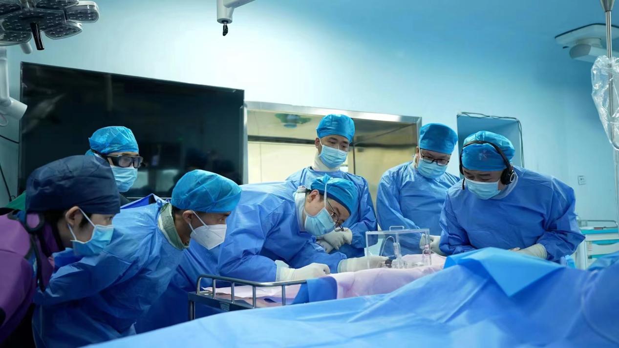 中国科学院院士、东南大学附属中大医院滕皋军教授(右一)带领团队成员正在为患者实施手术。