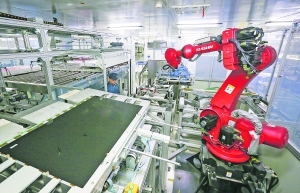 贵阳海信电视装配生产线上,智能机器人在传送一块65英寸的大屏幕。(资料图片)
