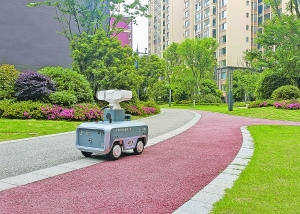 龙里县中铁国际生态城太阳谷5G全感知智能康养社区内的无人驾驶安防车在运行中(5月23日摄)。 新华/传真