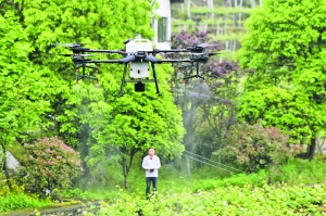 在息烽县小寨坝镇红岩村,农技人员在葡萄基地进行无人机植保作业(2021年4月17日摄)。 新华/传真