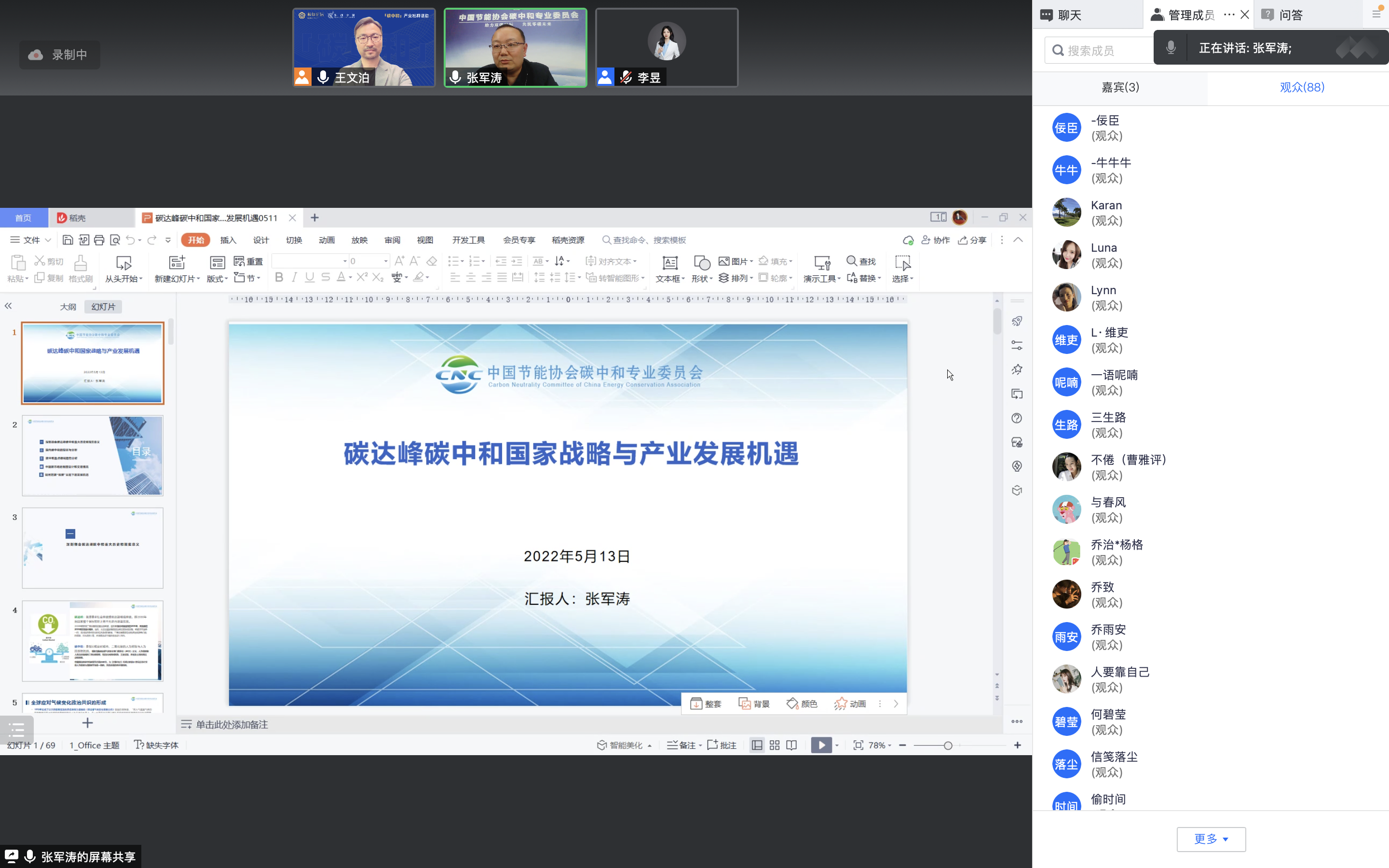 常务副秘书长张军涛分别以“碳达峰碳中和重大历史和现实意义”、“国内碳中和的现状与分析”“碳中和重点领域趋势分析”、“中国碳市场的制度设计和交易情况”以及“如何把握双碳之下的发展机遇”等五个方向,深入的进行了分析与解答。张军涛表示要全面提速可再生能源和新能源发展,强化顶层设计,落实国家的规划及配套政策的同时,要避免“生态打架”。大力推进交通领域和新能源汽车以及在其他方面的应用。