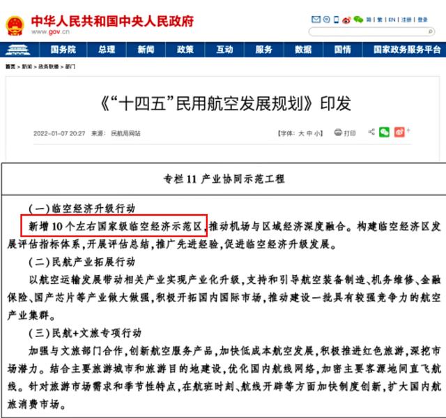 今年公布的《十四五”民用航空发展规划》中提出5年里要新增10个左右国家级临空经济示范区,推动机场与区域经济深度融合。