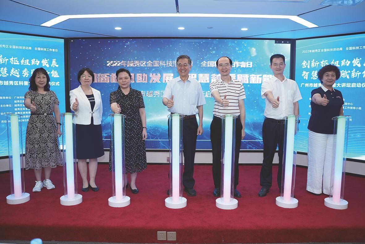 在大家的见证下,在场领导、嘉宾共同为“创新枢纽助发展,智慧越秀赋新能”广州市越秀区科普大讲坛按下启动键。