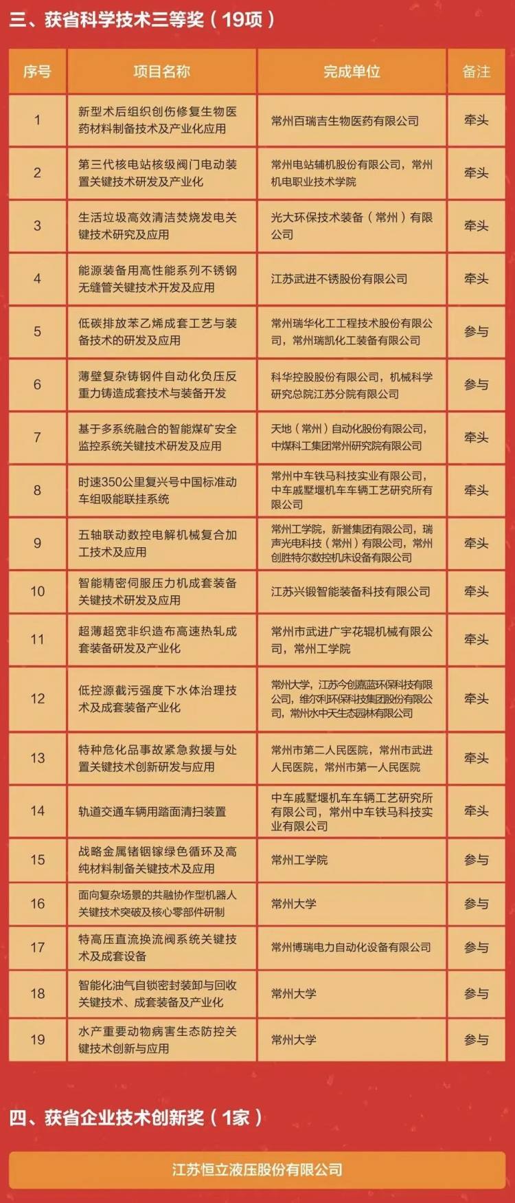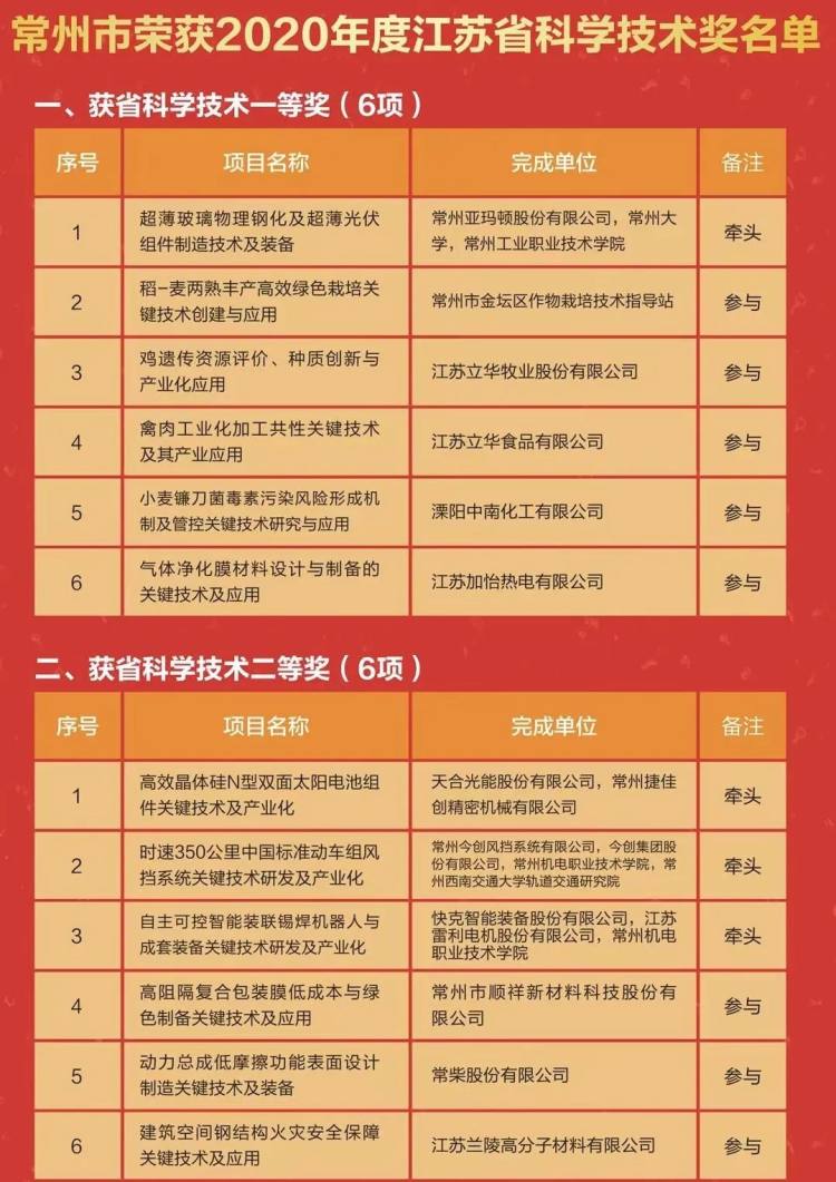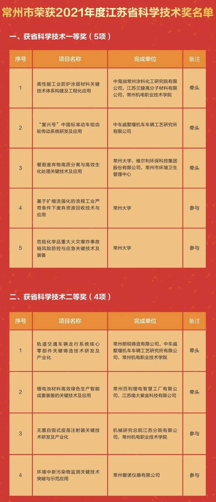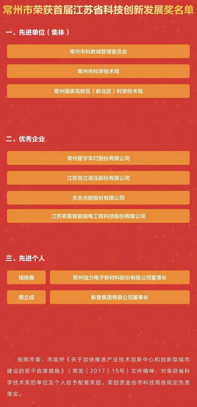 根据《省政府关于表彰首届江苏省科技创新发展奖先进单位(集体)、优秀企业、先进个人的决定》(苏政发[2021]50号),常州市荣获先进单位(集体)3家,优秀企业4家,先进个人2名。