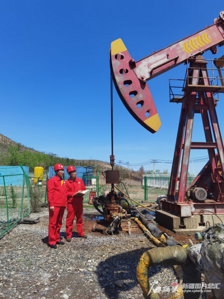 杨曙光(左)来到乌市骑马山上的煤层气开采井场观测。石榴云/新疆日报记者于江艳摄