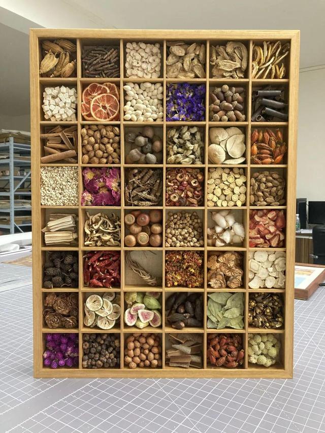有位餐馆老板寄来花椒、干辣椒等十多种常用调味料让装裱,后放置在新开张的餐馆大堂,寄托着老板对厨艺的热爱。
