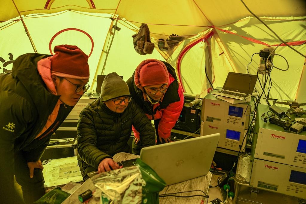 5月3日,在珠峰登山大本营,科研人员查看大气数据。新华社记者 姜帆 摄