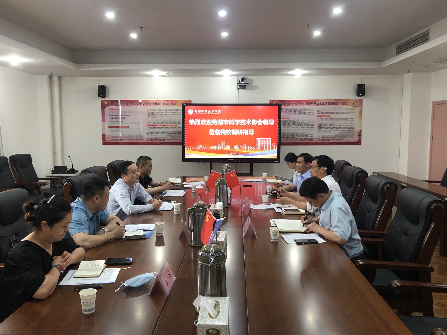 6月2日,市科协党组成员、副主席徐春芳一行5人到芜湖职业技术学院调研高校科协工作,芜湖职业技术学院党委副书记袁家和,校党委委员、园林园艺学院党支部书记朱志国,校科研处处长、科协副主席吴庆国等参加了调研。