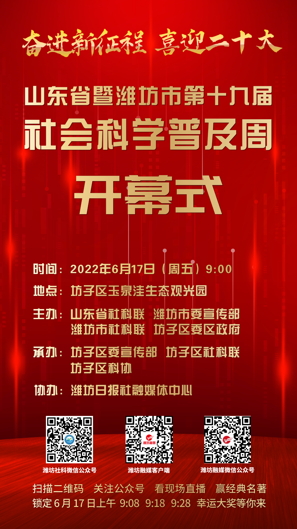 山东省暨潍坊市第十九届社会科学普及周近日启动,开幕式将于6月17日上午9时在坊子区玉泉洼生态观光园举行,采取现场举办与线上同步直播相结合的方式呈现,三轮抽奖等待您的参与。