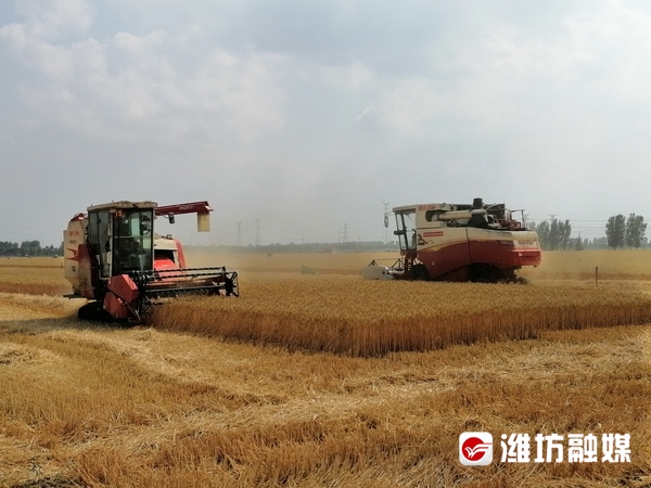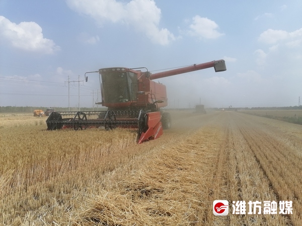 6月11日下午,昌邑市柳疃镇青阜农业综合体2.3万亩小麦开机收割。伴随着机械的轰鸣声,数十辆收割机、搂草机、打包机在麦田里穿梭作业,从麦苗收割到秸秆打包,全程机械化大大提高了作业效率。金灿灿的麦粒从放粮筒喷涌而出,收获的喜悦写满农人的脸庞。