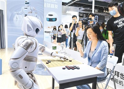 在2021世界人工智能大会展览现场,观众与仿人机器人下象棋对弈。杨建正摄(人民视觉)