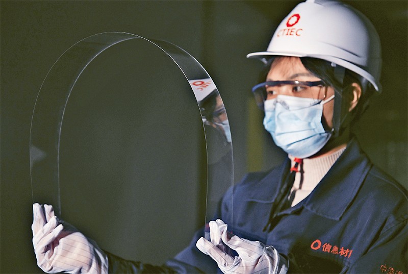 2021年12月21日,在安徽省蚌埠中建材信息显示材料有限公司,工作人员在展示一款超薄电子信息显示玻璃。新华社记者 张端/摄