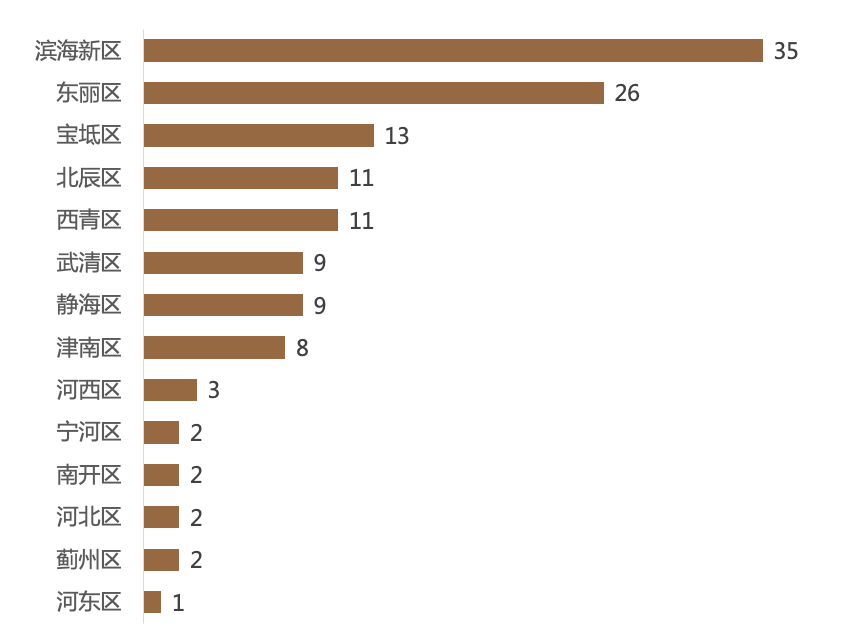 从区域来看,“科技推广和应用服务业”等数量较多的行业企业也主要集中于滨海新区和东丽区。这与两区拥有相关的科技产业园区不无关系,比如滨海新区就是定位为天津数字经济发展先行区。
