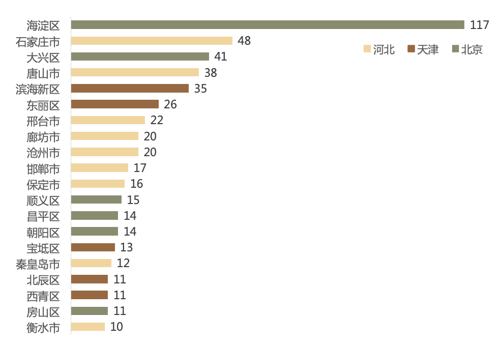 综合京津冀三地各市、区来看,专精特新“小巨人”企业数量前十位的地区之中,以河北城市数量最多,占据6席,北京、天津各两席。在前二十位的地区中,河北占据九席,北京为六席,天津为五席。