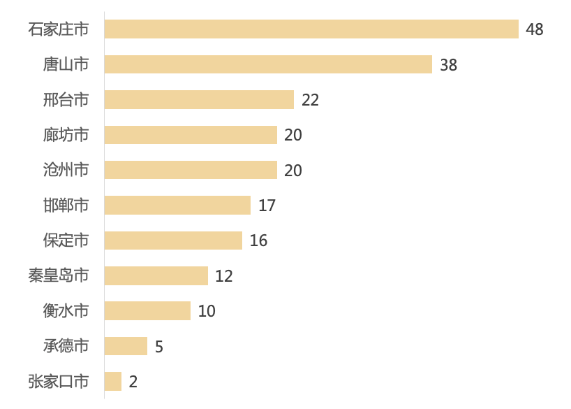 整体来看,“小巨人”企业在河北各城市的分布较为均衡,这与河北整体产业结构较为接近,且经济体量上,除唐山、石家庄外,各地之间的差距较小有关系。