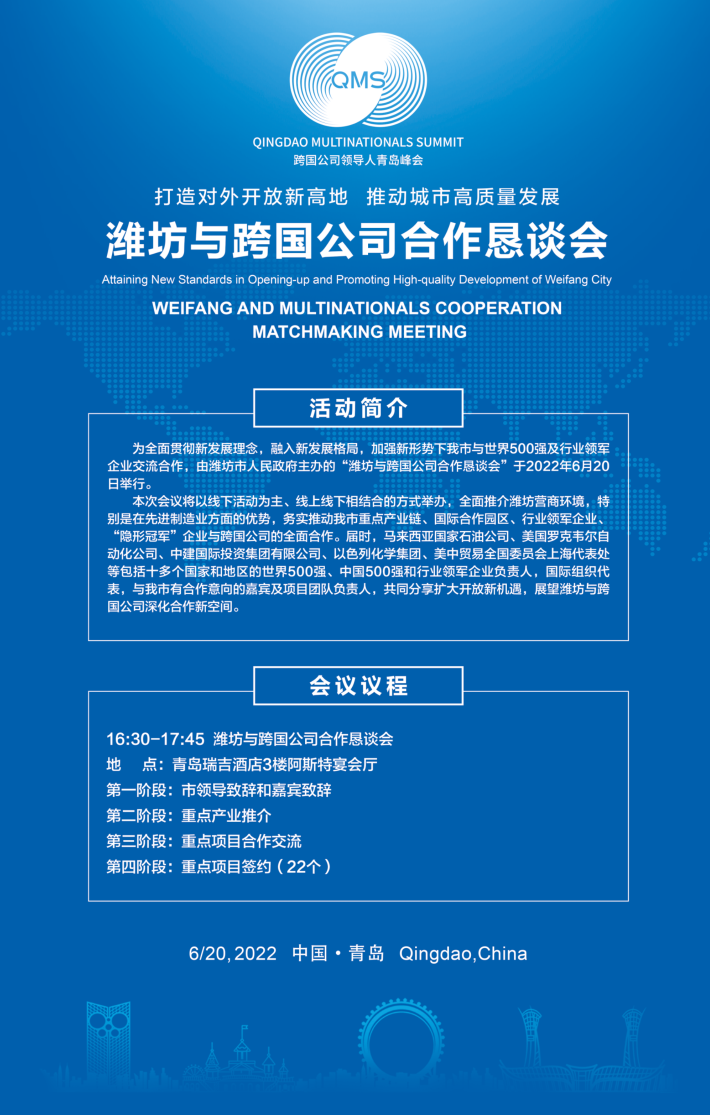 作为第三届跨国公司领导人青岛峰会的重要配套活动,我市积极筹备“潍坊与跨国公司合作恳谈会”将在6月20日下午举行,会议以线下活动为主,采用线下线上相结合的方式举办。