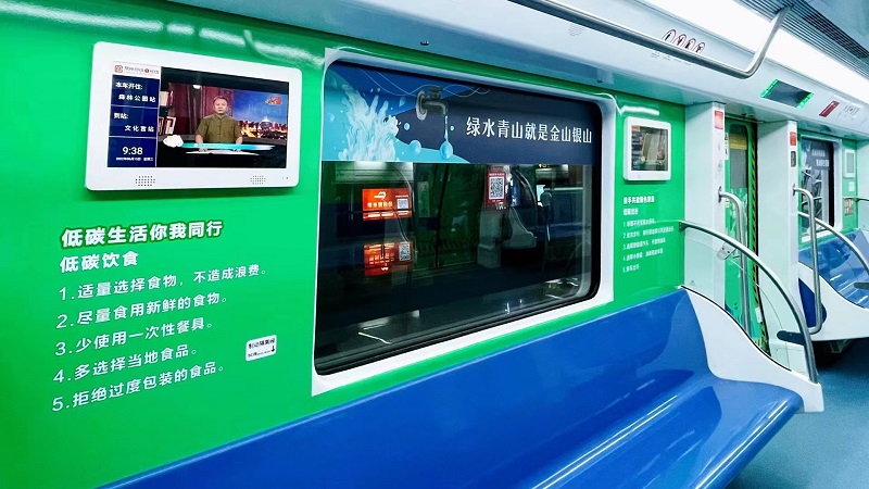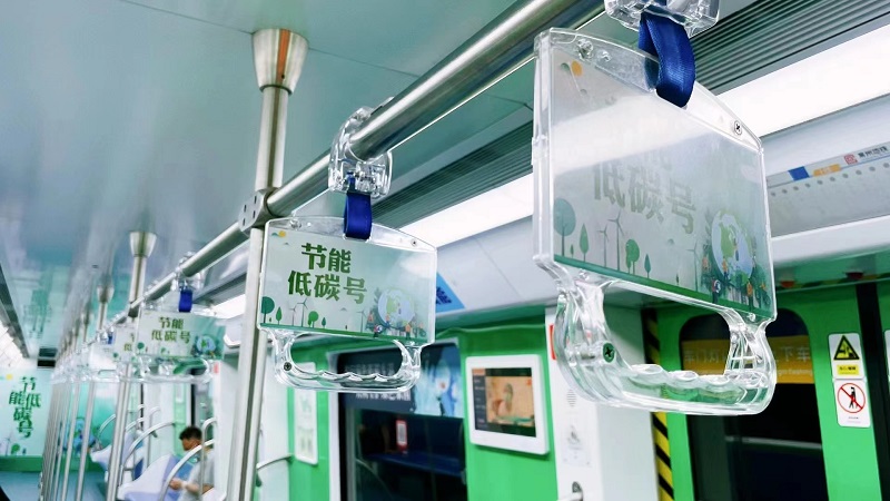 6月15日是第10个全国低碳日,围绕节能宣传周活动主题,由市工信局联合相关部门打造的常州地铁1号线“节能低碳号”专列正式开通。专列内6节车厢以蓝色和绿色为主背景色调,在列车拉手、窗贴、侧顶帖、门贴、墙贴等部位,分别采用不用内容素材标语进行宣传,并结合宣传标语用各式动漫画面板推出节能减碳小贴士,以此方式将更多的节能理念及减碳知识传递给每一位乘客。