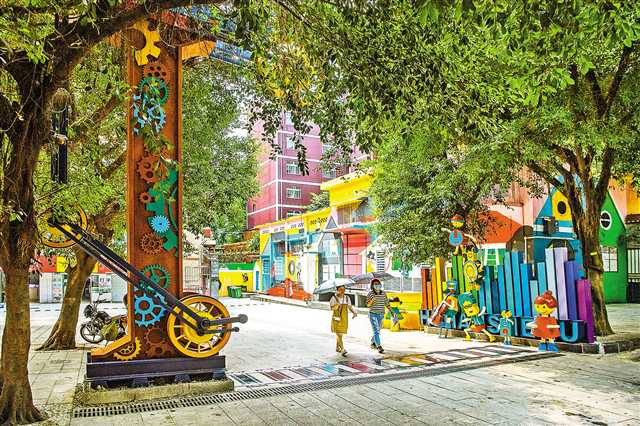 6月20日,大渡口区新山村街道沪汉社区,居民们从五彩涂鸦的文化景观中过。