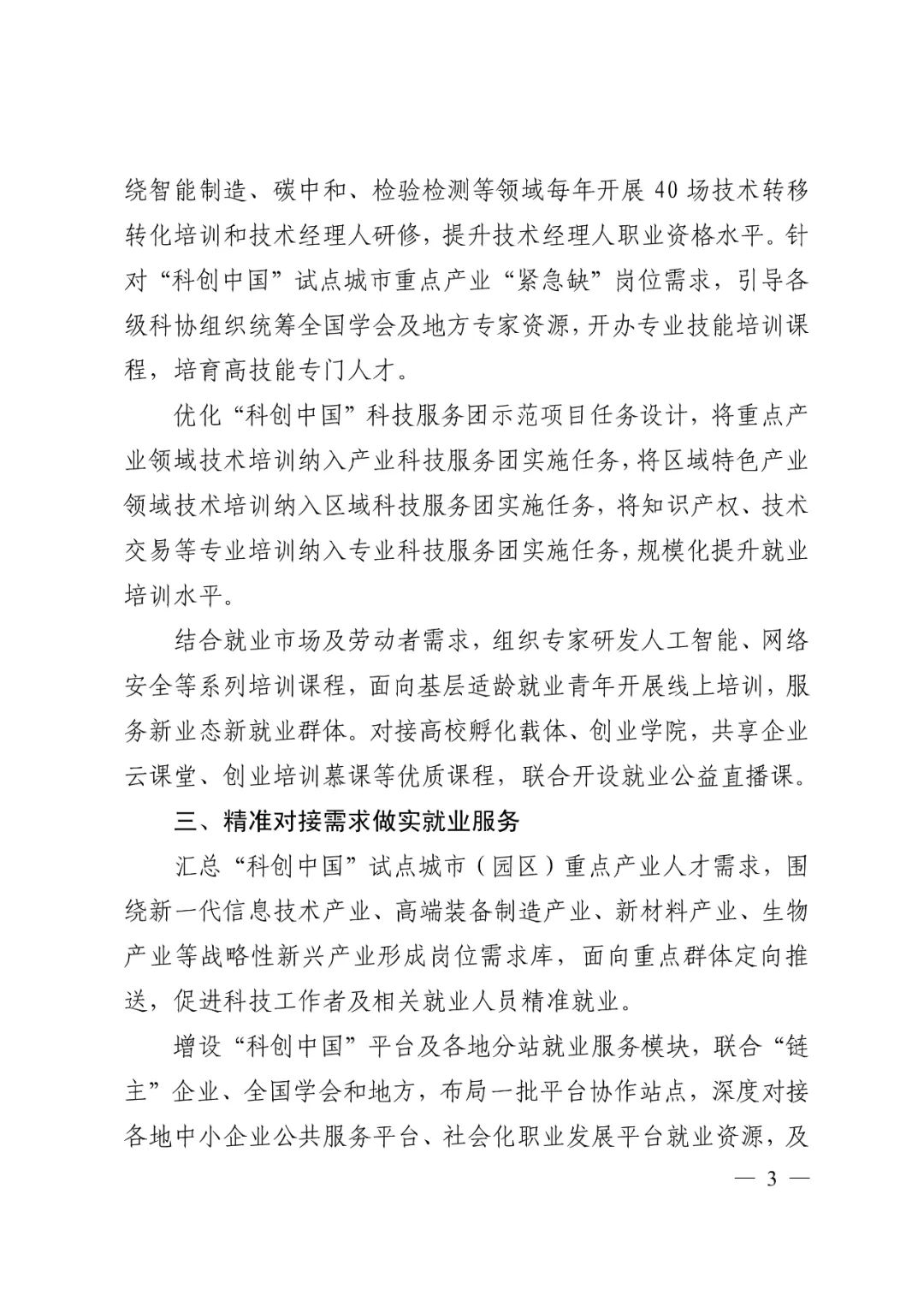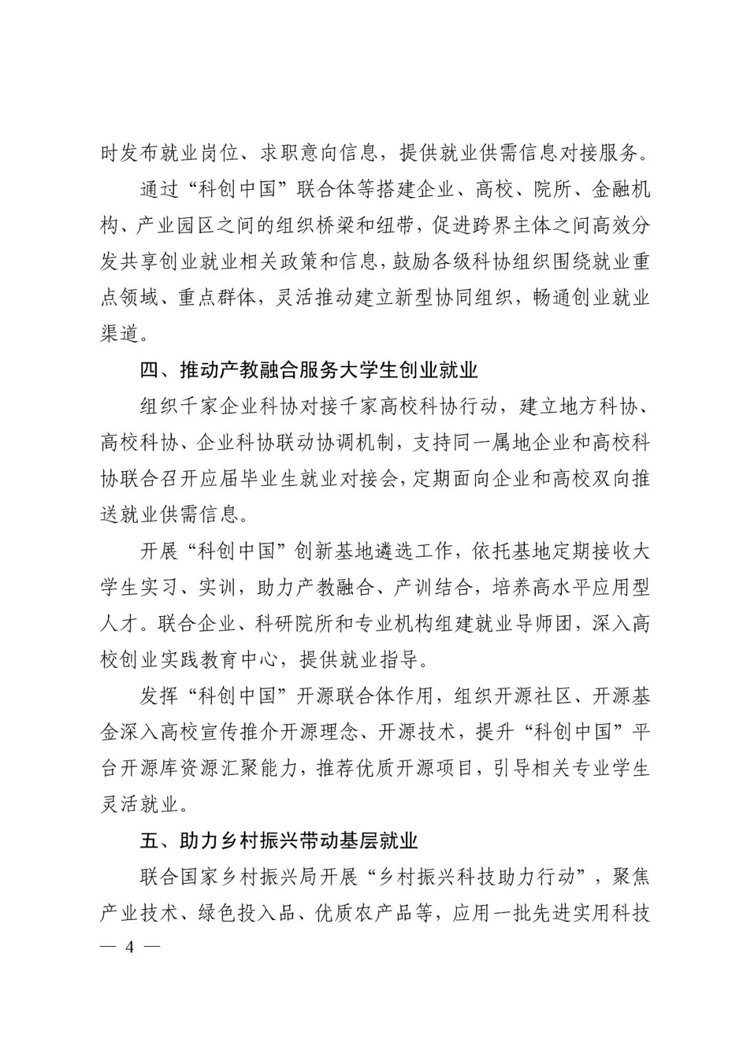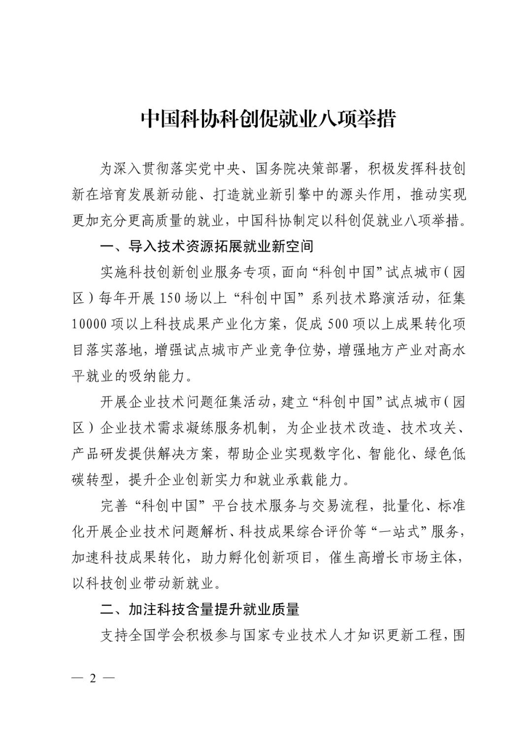 《中国科协科创促就业八项举措》提出,每年开展150场以上“科创中国”系列技术路演,征集1万项以上科技成果产业化方案,促成500项以上成果转化项目落实落地;支持全国学会、地方科协每年一系列专业技能培训;组织千家企业科协对接千家高校科协,双向推送大学生就业供需信息;应用一批农业先进实用科技成果,推广一批农业可持续发展模式,培育一批新型农业生产经营主体;组织一批重点区域、关键领域创新创业赛事活动,举办一系列产学融合会议论坛;围绕地方产业政策、企业发展、就业环境产出一批智库研究成果,挖掘凝练一批科创带就业的典型案例。中国科协将通过以上举措,聚集科协“一体两翼”合力,建平台、导资源、增动能、促就业,引导科技创新资源为提振创业就业、推动经济社会高质量发展提供有力支撑。