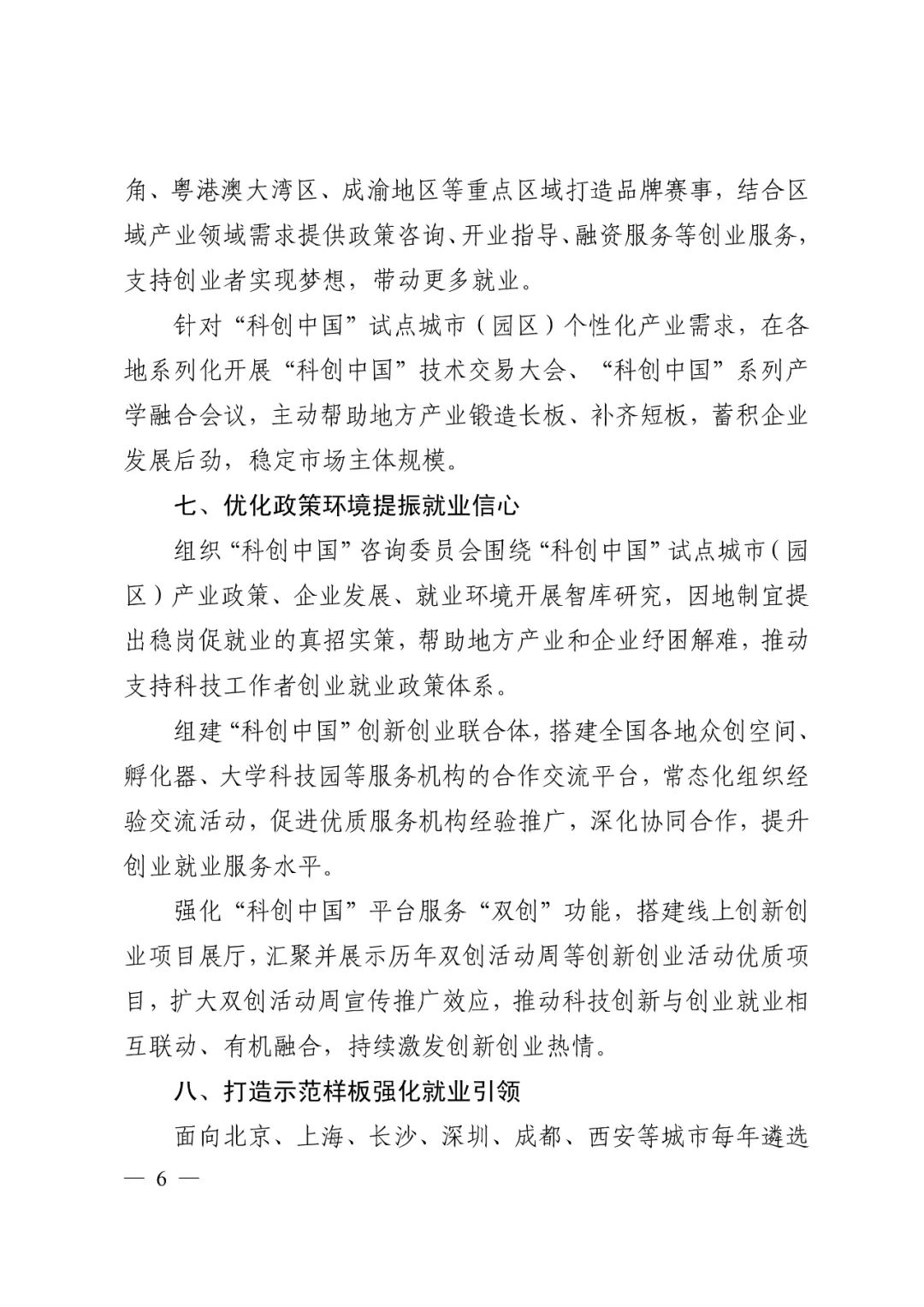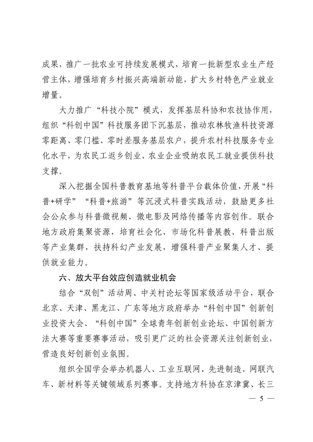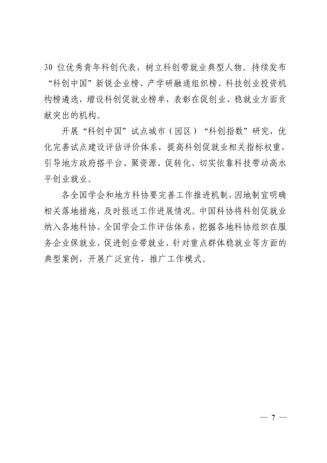 《中国科协科创促就业八项举措》提出,每年开展150场以上“科创中国”系列技术路演,征集1万项以上科技成果产业化方案,促成500项以上成果转化项目落实落地;支持全国学会、地方科协每年一系列专业技能培训;组织千家企业科协对接千家高校科协,双向推送大学生就业供需信息;应用一批农业先进实用科技成果,推广一批农业可持续发展模式,培育一批新型农业生产经营主体;组织一批重点区域、关键领域创新创业赛事活动,举办一系列产学融合会议论坛;围绕地方产业政策、企业发展、就业环境产出一批智库研究成果,挖掘凝练一批科创带就业的典型案例。中国科协将通过以上举措,聚集科协“一体两翼”合力,建平台、导资源、增动能、促就业,引导科技创新资源为提振创业就业、推动经济社会高质量发展提供有力支撑。