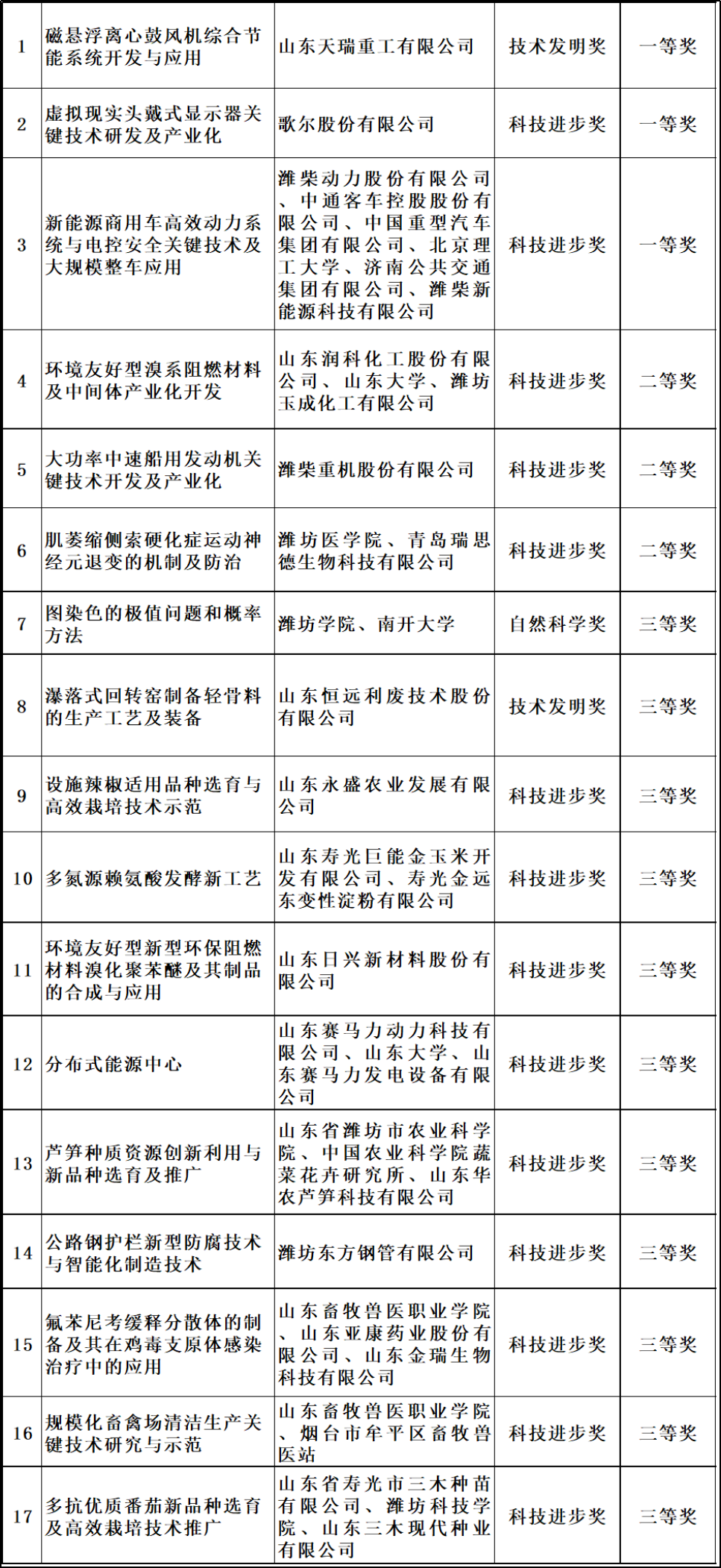 6月22日,山东省科技创新大会召开,会上表彰了2021年度山东省科学技术奖获得者,潍坊17个项目获奖,其中,天瑞重工“磁悬浮离心鼓风机综合节能系统开发与应用”项目获得全省唯一一个技术发明一等奖,实现了我市省技术发明一等奖零的突破。歌尔股份有限公司的虚拟现实头戴式显示器关键技术研发及产业化、潍柴动力股份有限公司等的新能源商用车高效动力系统与电控安全关键技术及大规模整车应用获得科技进步奖一等奖。