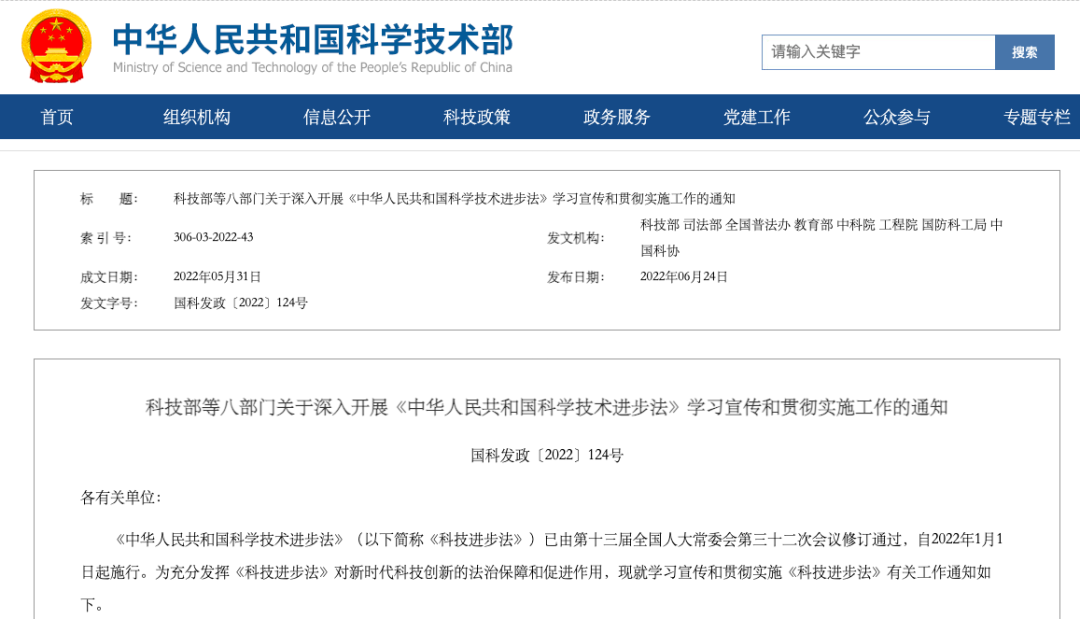 6月24日,科技部、司法部等八部门联合公布《关于深入开展<中华人民共和国科学技术进步法>学习宣传和贯彻实施工作的通知》(以下简称《通知》),通过深入宣传和贯彻工作,使《中华人民共和国科学技术进步法》(以下简称《科技进步法》)深入人心,提升科技管理人员依法行政能力,激发科技创新主体活力,动员社会各方力量广泛参与和支持科技事业发展,为加快实现科技自立自强、建设世界科技强国提供更为坚实的法治保障。