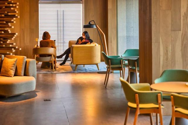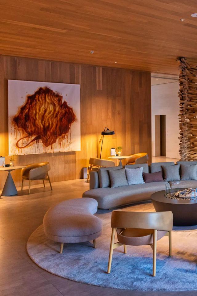 大堂旁的沐风空间,阳光至头顶的天窗倾洒而下,四周浅灰色的石墙环绕,中间却独留出一处与自然对话的景框。