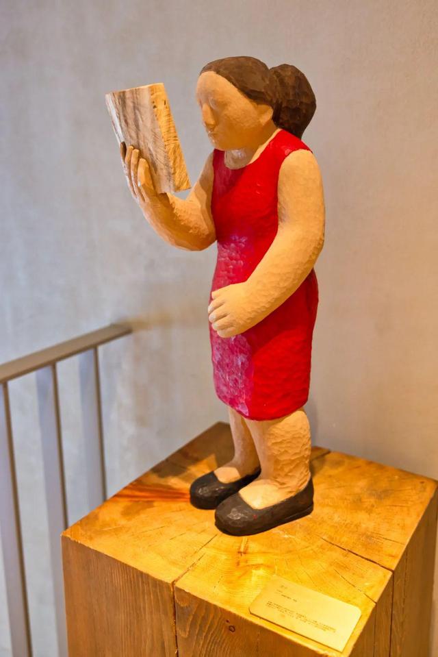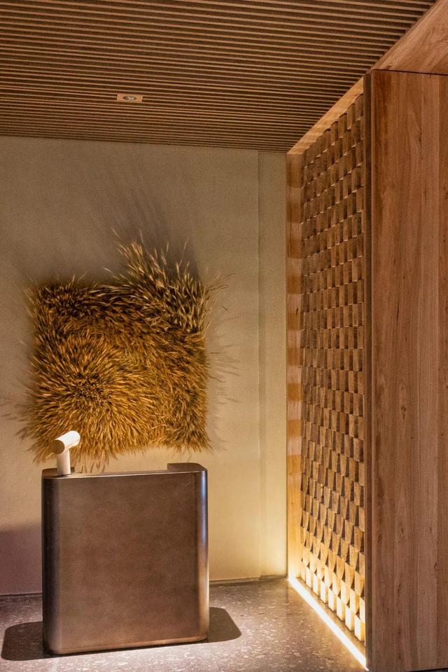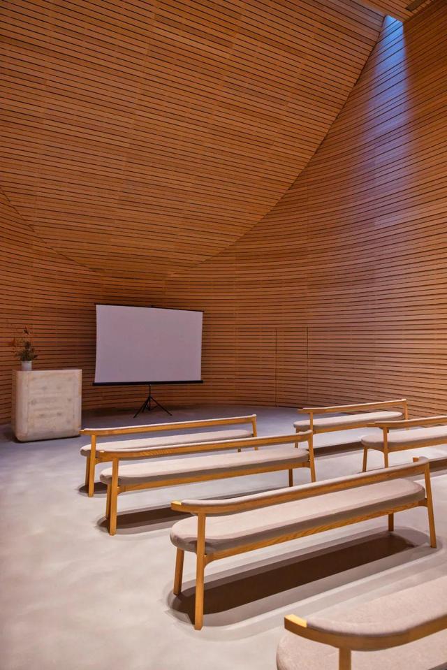 与外壳的坚硬清冷不同,联投白石美术馆的内里,却用淡淡暖色的木石营造出一片温暖舒适的氛围。