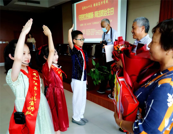 现场举行党员政治生日仪式,为河滨社区丁洪库、华粉梅、李秀珍3位党员庆祝政治生日。河滨社区党总支部书记唐惠娟同志向过“政治生日”的党员致贺词,并带领少年队员分别送上生日礼物、鲜花和手工党徽,党员代表李秀珍发表政治生日感言。大家全体起立,举起右手,握拳宣誓,随着铿锵有力的一字一句,党员同志们胸中燃起一股热流,曾经入党时的一幕幕重现眼前。青年党员虞子宣说,“今天的仪式,让我们接受了深刻的党性教育,让党员重新回忆党组织的培养历程,提醒我们始终牢记入党时的铮铮誓言。”