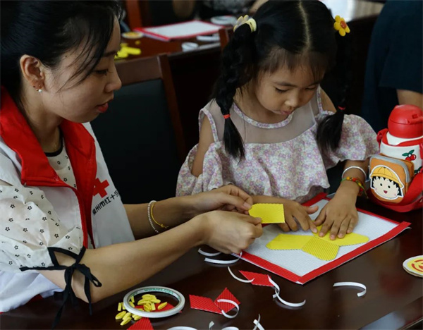 巧手传情庆“七一”,同心逐梦赞中华。社工王陈娟讲述了党徽图案的意义,以红色与黄色作为主色调,从党徽的制作方法,到辅助工具的使用技巧,耐心的为大家讲解、示范。党员们和青少年边构思边制作,镰刀、锤头、底盘、相框逐步成形,一幅幅包含着无限忠诚与热爱的党徽作品展现在大家面前。大家满心欢喜、荣誉感满满。“通过自己的双手制作出党徽,用自己的双手表达对党、对‘七一’的真挚祝福,感觉非常有意义,同时希望国家越来越好。”社区老党员谢才保说。