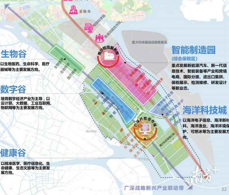 生物谷、数字谷、健康谷紧邻产业发展带,与周边产业组团形成南部战略性新兴产业集聚区,成为南沙发展新一代信息技术人工智能、生物医药与健康等新兴产业的重要载体空间。